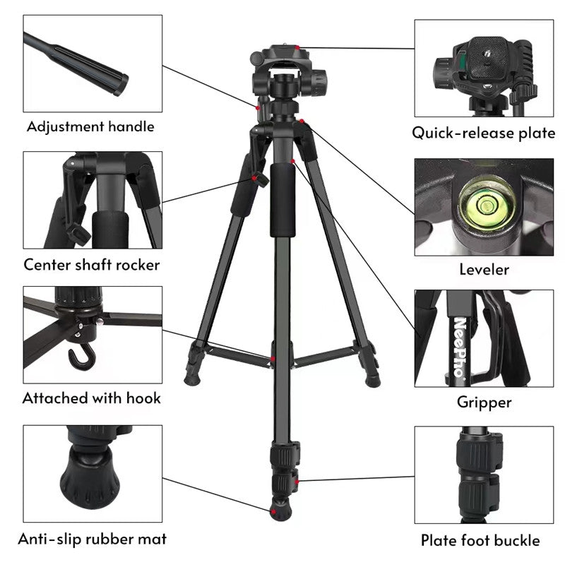 El trípode profesional NeePho 8820 está diseñado para cámaras y videocámaras domésticas, ofreciendo estabilidad superior y facilidad de uso. Su estructura compacta y ligera facilita su transporte, mientras que sus pies de goma aseguran una fijación firme en cualquier superficie para eliminar el desenfoque provocado por movimientos indeseados. Con un diseño de 3 secciones ajustable entre 58 y 150 cm, permite lograr tomas versátiles con máxima comodidad y precisión. Ideal para capturar imágenes nítidas y momentos únicos con profesionalismo.